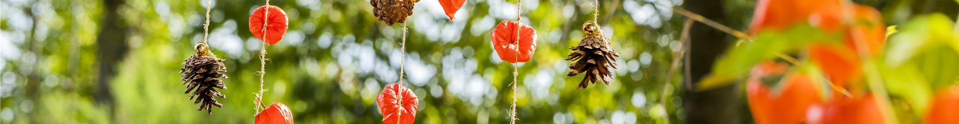 Tannenzapfen, Physalis und Glöckchen werden dann so lange an Fäden an dem Stock festgeknotet, bis das Windspiel gefällt. Dabei sollte es aber auch nicht zu dicht hängen, damit sich die einzelnen Fäden nicht im Wind verheddern. Ein Wechsel mit unterschiedlichen Längen sieht genauso hübsch aus, wie eine feste Form. Sind alle Musiker am Stock befestigt, kann an beiden Enden noch eine weitere Schnur befestigt werden. An dieser kann das Windspiel dann an seinen neuen Platz im Garten. Überstehende Enden vom Paketband können einfach mit einer Schere abgeschnitten werden. Wenn dann der Wind durch das herbstliche Windspiel fegt, ertönt ein leichtes Klingeln und kündigt die stürmische Jahreszeit an.
