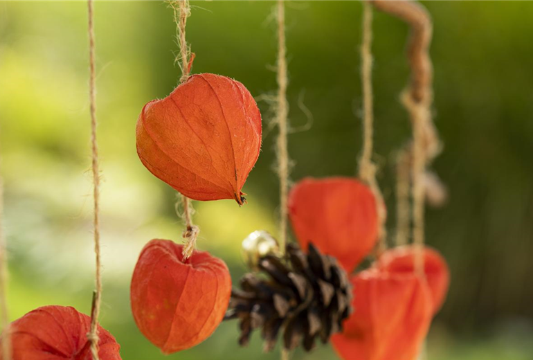 Ein herbstliches Windspiel aus Physalis und Tannenzapfen