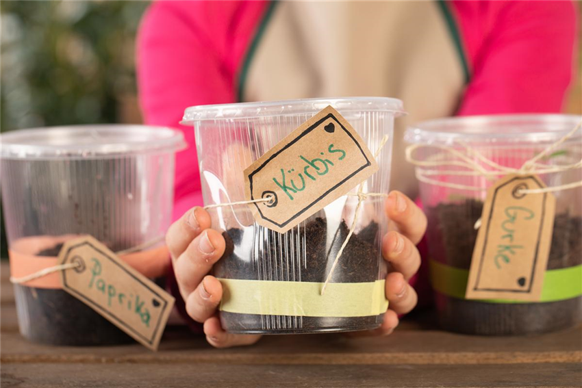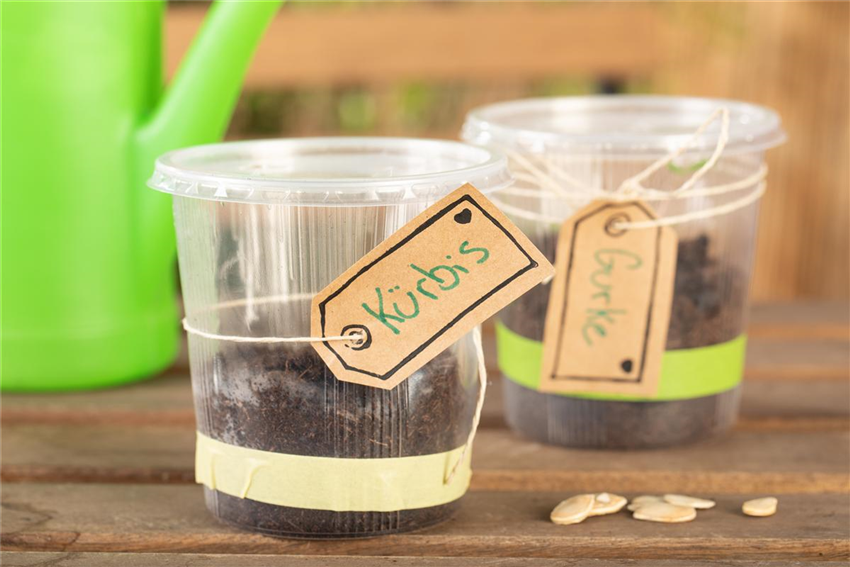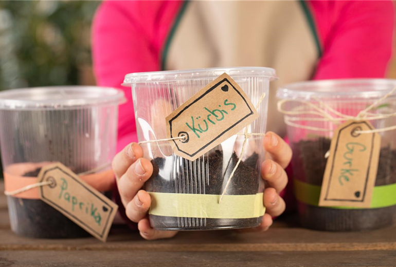Im Supermarkt gibt es oft schon fertigen Salat zu kaufen. Das ist natürlich praktisch, wenn’s schnell gehen muss, aber oft ist der in Plastikbechern verpackt, die dann achtlos weggeworfen werden. Damit das nicht passiert, kann aus den Plastikbechern en kleines Mini-Gewächshaus gebastelt werden. Dafür werden die Becher ungefähr zur Hälfte mit Anzuchterde befüllt und die Samen eingesetzt. In die Deckel der Plastikbecher werden dann mit einem Cuttermesser kleine Kreuze geschnitten, die an den Kanten umgeknickt werden. So entstehen kleine Luftlöcher. Nachdem das Mini-Gewächshaus noch gut angegossen wird, wird der Deckel auf den Becher gesetzt und das Mini-Gewächshaus an einen hellen Ort gebracht, an dem die Samen gut keimen können.