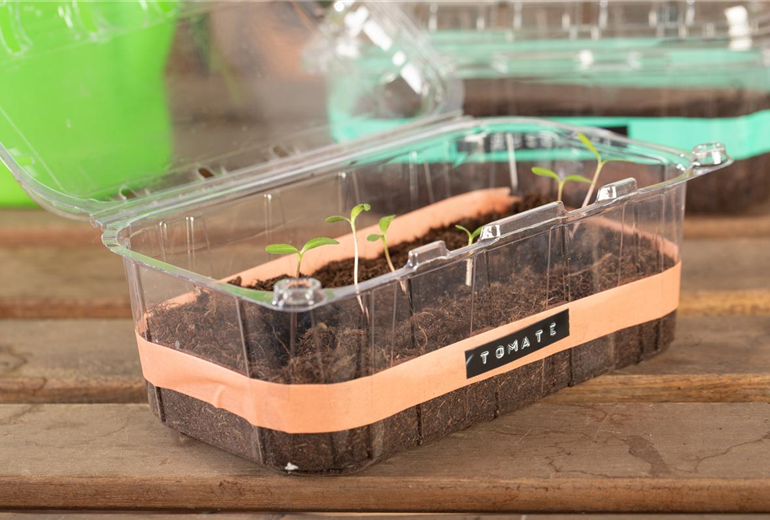 Weintrauben sind oft in einer Plastikschale verpackt. Wofür die gut sein soll, weiß man irgendwie nicht so genau, aber jetzt bekommt sie eine Aufgabe. Damit aus der Weintraubenschale ein Mini-Gewächshaus wird, wird die Schale ungefähr zu Hälfte mit Anzuchterde gefüllt. Anschließend werden die Samen eingesetzt und die Weintraubenschale gut gegossen. Die Erde sollte dabei feucht, aber nicht klitschnass sein. Anschließend wird der Deckel der Weintraubenschale geschlossen und das Mini-Gewächshaus auf eine sonnige Fensterbank gestellt. Falls im unteren Teil der Weintraubenschale Abtropflöcher vorhanden sind, kann das Mini-Gewächshaus auf einen Teller oder in eine Schale gestellt werden, damit es beim Gießen nicht für eine Überflutung sorgt. Ein Klebeband rund um die Schale kann beschriftet werden, damit man den Überblick behält, was wo wächst.