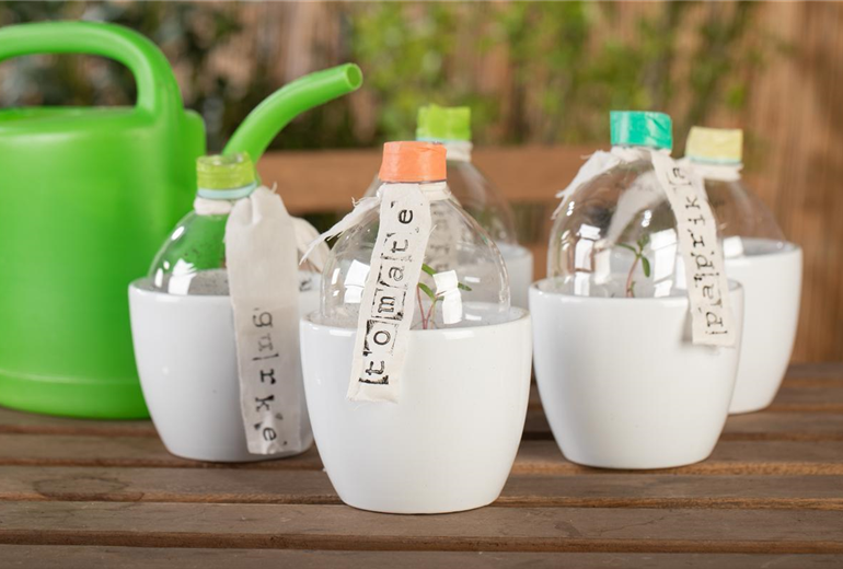 Plastikflaschen sind ein riesiges Problem. Aber damit die nicht ungenutzt im nächsten Park landen, können die Plastikflaschen sinnvoll recycelt werden. Zusammen mit einem Blumentopf und Anzuchterde werden aus alten Plastikflaschen kleine Mini-Gewächshäuser. Dafür werden kleine Blumentöpfe mit Anzuchterde befüllt. In die Anzuchterde kommen dann die Samen. Die Auswahl bleibt natürlich dem persönlichen Geschmack überlassen. Anschließend noch gut angießen und dann kommen die Flaschen zum Einsatz. Von den Plastikflaschen werden mit einem Cuttermesser die Hälse abgeschnitten. Von denen wird dann der Decke abgeschraubt und die Flaschenhälse mit der Schnittkante nach unten auf die Erde gesetzt. Um den Flaschenhals kann man dann noch ein Band knoten, auf den die Namen der Pflanzen geschrieben werden. An einem sonnigen Platz gedeihen die jungen Pflanzen dann prächtig.