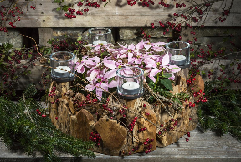 Anstelle des klassisch grünen Adventskranzes kann man auch aus Weinreben, wildem Hopfen oder anderen rankenden Pflanzen einen Kranz binden. Das kann – muss aber nicht – auch ohne einen Rohling geschehen, um dem Kranz eine gewisse Leichtigkeit zu verleihen. Der Phantasie sind hier kaum Grenzen gesetzt, außer dass aus Sicherheitsgründen auf einen guten Stand der Kerzen geachtet werden sollte. Als Kerzen eignen sich dafür zum Beispiel hohe schlanke Tafelkerzen, die in passende kleine Ständer gesteckt werden können. Beim Binden sollte direkt berücksichtigt werden, dass die Kerzenständer später noch standsicher einzuarbeiten sind. Alternativ zu den Tafelkerzen sind mit entsprechenden Steck- oder Klemmhaltern auch Baumkerzen oder Teelichte denkbar. Wer echte Kerzen nicht ständig beaufsichtigen will oder kann, der kann auf Echtwachs LED Adventskranzkerzen ausweichen. Die sind inzwischen sogar mit Flacker-Effekt und Fernbedienung erhältlich.