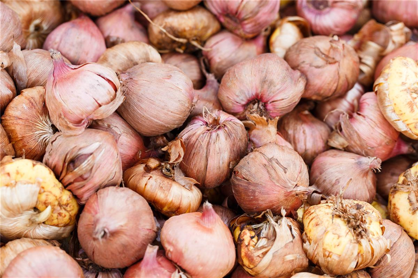 Wenn Sie die Pflanze ausgegraben haben, werden die Stängel auf etwa 1 bis 2 Zentimeter über der Knolle gestutzt. Gartenerde sollte vorsichtig und gründlich entfernt werden. Sitzt die Erde sehr fest, können Sie die Knollen ein paar Tage an einem warmen Ort trocknen lassen. Dann lassen sie sich leichter reinigen. Außerdem wird die Zwiebelhaut entfernt sowie kleine Nebengewächse, die so genannten Brutzwiebeln. Wenn Sie die Knolle vorbereitet haben, lassen Sie sie zur Sicherheit eine weitere Woche vollständig trocknen, bevor sie ins Winterquartier einzieht. Auch sollten die Knollen auf Fäulnis und weiche Stellen geprüft werden. Bewahren Sie nur gesunde Knollen auf. Die meisten Knollenschäden lassen sich äußerlich gut erkennen. Verfärbungen und verhärtete oder weiche Stellen sind Hinweise auf Krankheiten wie Lackschorf, Septoria-Knollenhartfäule oder Fusarium-Trockenfäule. Auch Thripse sind eine bekannte Plage. Die frühzeitige Entnahme der Knollen aus dem Boden reduziert die Gefahr eines Befalls.