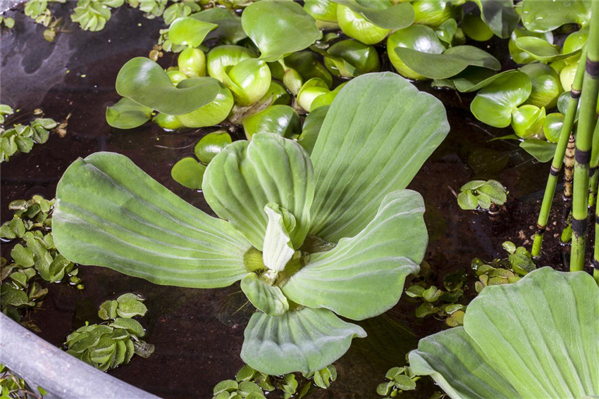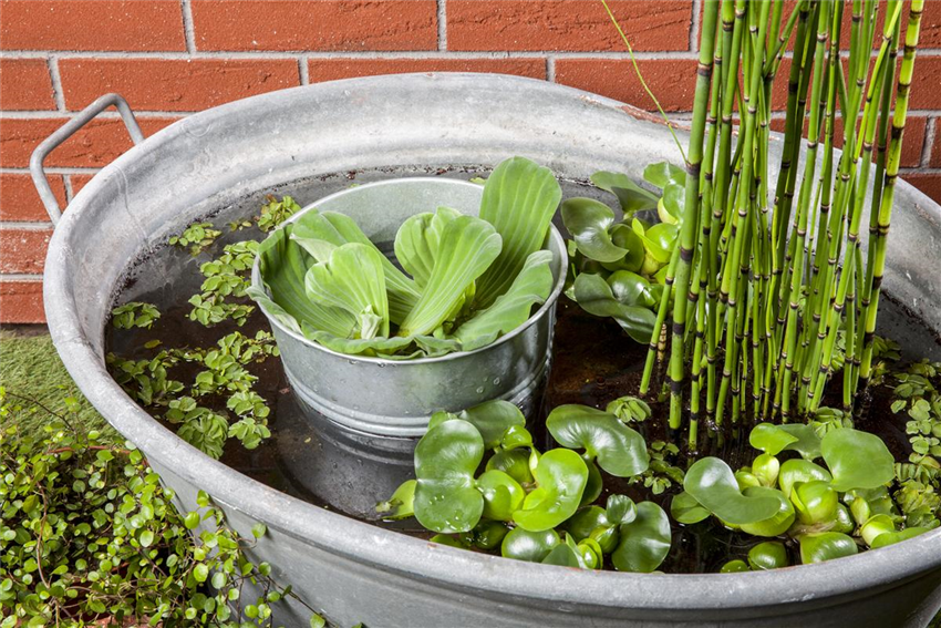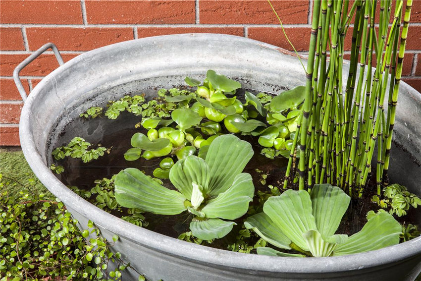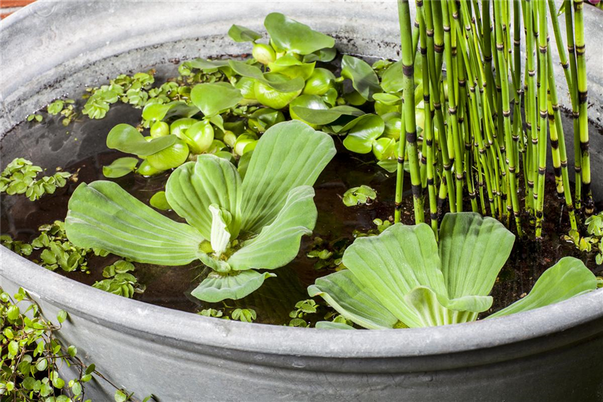 Damit die Pflanzkörbe im Mini-Teich stabil stehen können, wird der Grund des Gefäßes mit Kieselsteinen befüllt. Dann werden die Pflanzkörbe eingesetzt und diese ebenfalls mit weiteren Kieselsteinen fixiert. So schwemmen die Pflanzkörbe nicht aus und finden sich nicht plötzlich an der Wasseroberfläche wieder. Generell sollte darauf geachtet werden, dass die Wurzeln der Pflanzen frei von Erde sind. Je mehr Nährstoffe in den Mini-Teich gelangen, desto schwieriger wird es für das kleine Biotop, das ökologische Gleichgewicht aufrecht zu erhalten, das der Mini-Teich braucht, um sich quasi selbst zu pflegen. Deshalb sollte bei einem Mini-Teich auch unbedingt auf einen Fischbesatz verzichtet werden. Zum einen natürlich, damit der Mini-Teich nicht kippt, zum anderen aber auch, weil ein kleiner Teich nicht den nötigen Platz bietet, damit die Fische einen artgerechten Lebensraum bekommen. Ein Fischbesatz ist eher für den großen Bruder, dem Gartenteich, geeignet. Leben kommt durch die Bepflanzung in den Mini-Teich. Kleinwüchsige und schmalblättrige Pflanzen wie Iris, Pfeilkraut und Riedgras eignen sich perfekt für die Bepflanzung im Mini-Teich und werden vom Besitzer so klein wie möglich gehalten. Auf der Wasseroberfläche sorgen dann, je nach Größe des Mini-Teiches, Wassersalat, Wasserhyazinthen oder Wasserlinsen für Farbe und schwimmen munter auf dem Mini-Teich.
